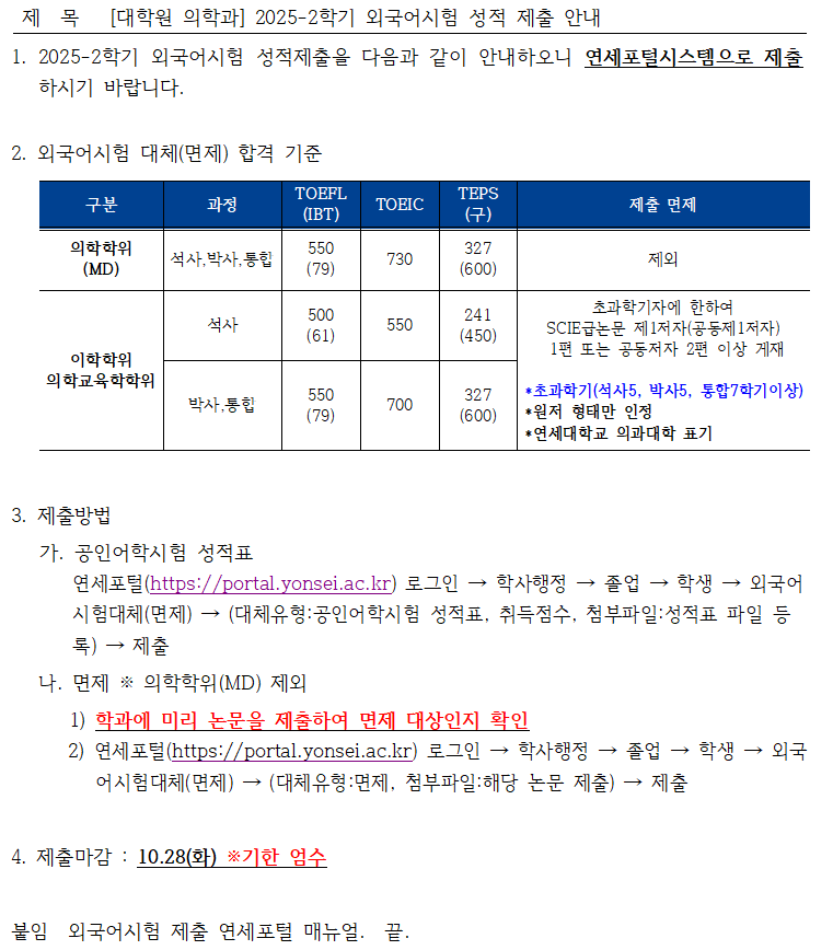 [대학원 의학과] 2025-2학기 외국어시험 성적제출 안내(~10.28까지)