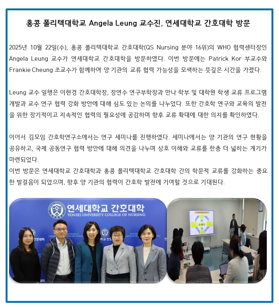 News 홍콩 폴리텍대학교 Angela Leung 교수진, 연세대학교 간호대학 방문 관리자 2025-10-23 조회수 17 공유하기 공유하기 페이스북 네이버블로그 카카오톡 카카오스토리 닫기 목록 이전글연세대학교 김모임간호학연구소, '2025 연세건강이음' 노인돌봄생활지원사 역량 강화 교육 성료 다음글다음글이 없습니다.